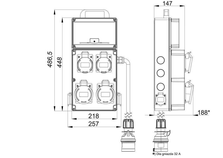 | Kabel zasilający z wtyczką | dla 16 A 5x2,5 mm² długość 1,5 m * dla 32 A 5x6 mm² długość 1,5 m * |