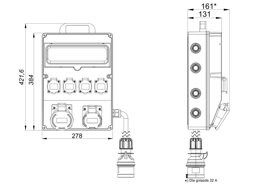| Kabel zasilający z wtyczką | dla 16 A 5x2,5 mm² długość 1,5 m * dla 32 A 5x6 mm² długość 1,5 m * |