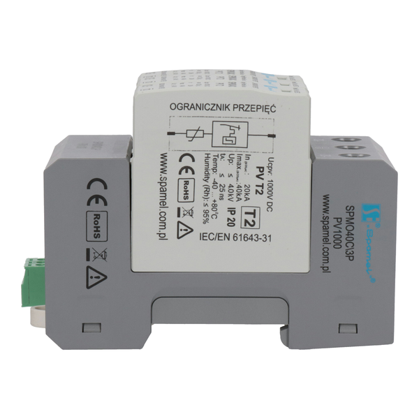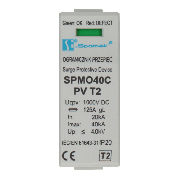 Ogranicznik przepięć serii SPMO-PV typu T2, klasa C, jest zaawansowanym urządzeniem zabezpieczającym, przeznaczonym do ochrony instalacji fotowoltaicznych (PV) przed przepięciami. Przepięcia mogą być wynikiem bezpośredniego uderzenia pioruna w pobliżu systemu, przełączeń w sieci elektroenergetycznej lub niestabilności systemu. Przez szybkie ograniczenie przepięć do bezpiecznego poziomu, chroni on drogie i wrażliwe urządzenia, takie jak inwertery, regulatory ładowania, oraz same panele fotowoltaiczne. Ograniczniki przepięć są niezbędnym elementem zapewniającym bezpieczeństwo i długotrwałą pracę instalacji fotowoltaicznych.