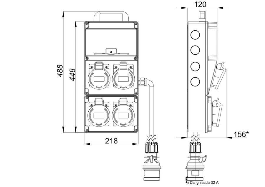 | Kabel zasilający z wtyczką | dla 16 A 5x2,5 mm² długość 1,5 m * dla 32 A 5x6 mm² długość 1,5 m * |