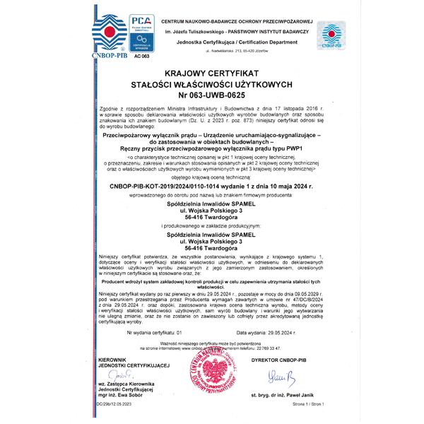 Krajowy Certyfikat Stałości Właściwości Użytkowych nr 063-UWB-0625