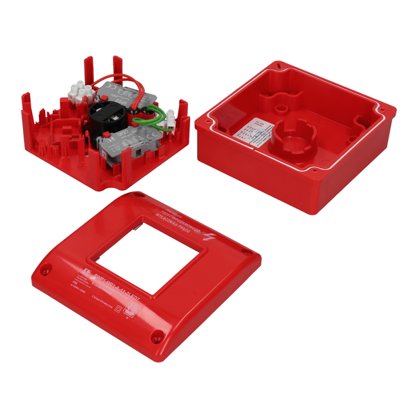 2. PWP1-W01-B-11-2LED7-wersja natynkowa z 1 łącznikiem zwiernym i 1 łącznikiem rozwiernym, led zielony na 230V/led czerwony na 230V.Po zbiciu szybki przycisk należy wcisnąć ręcznie.